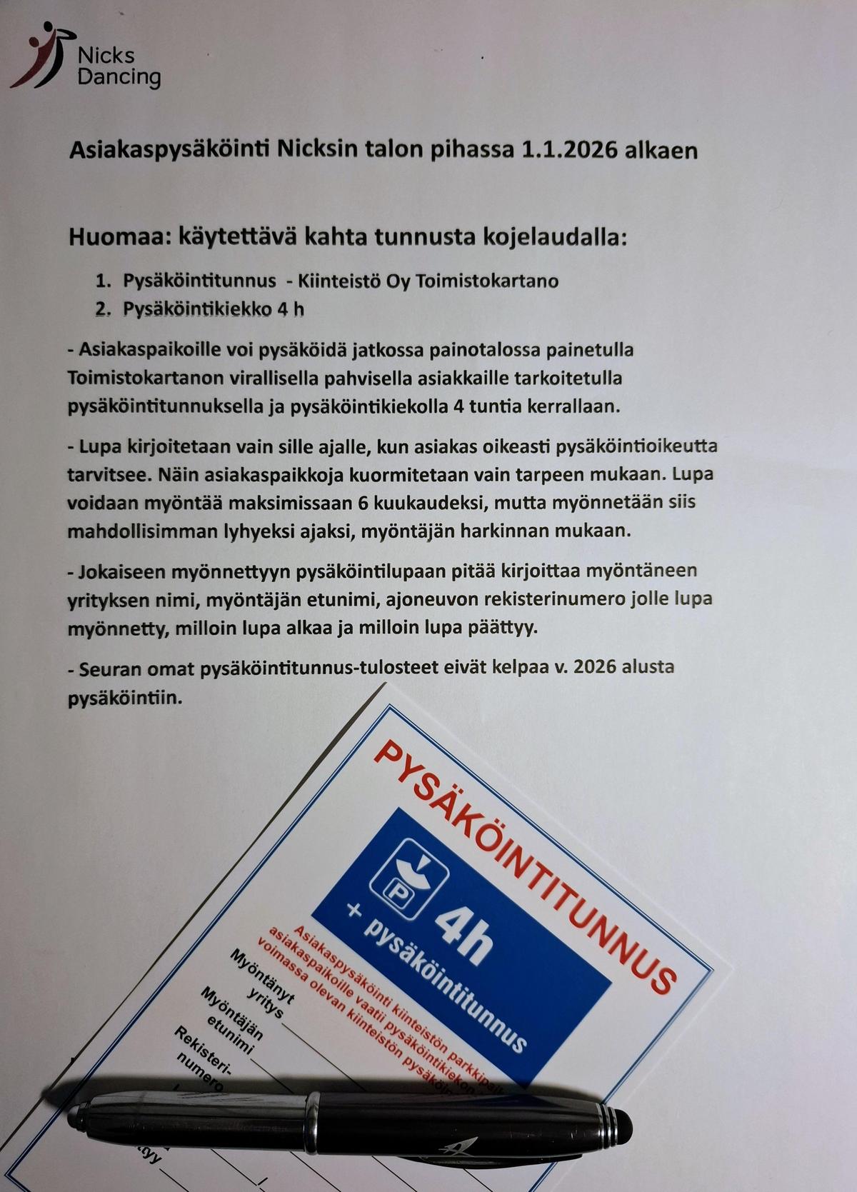 Seuran jäsenille on pysäköinti Nickin pihalla sallittu Pysäköintilupa-lapulla + pysäköintikiekolla Asiakas-merkityille paikoille.